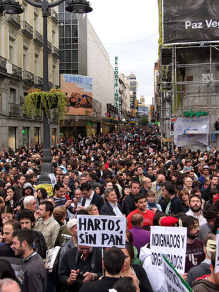 2) Cómo nace el movimiento 15M. He oído muchas versiones del proceso. Podría haber sido un movimiento espontáneo de personas vinculadas en redes sociales que deciden reunirse testimonialmente para mostrar la indignación que en las propias redes sociales, en parte promovida por el libro de Hessel, se estaba extendiendo a toda velocidad. Podría ser que estas personas fueran independientes y se tratara de una iniciativa puramente cívica, no apoyada por organizaciones políticas o sociales de más peso. Pero pudiera ser, también, que detrás de este movimiento se encontraran grupos de personas vinculadas a ciertas organizaciones radicales o a partidos políticos que han visto la ocasión ideal para sacar provecho. Estos militantes comprometidos habrían iniciado el movimiento, controlando y metiendo dentro de él a grupos político-sociales ya organizados que podrían darle ya un volumen suficiente de salida. No parece fácil que un movimiento así haya surgido por carambola de iniciatiavas ingenuas de simples dialogantes en las redes sociales. ¿Cuál ha sido su origen en realidad? No lo sé. Pienso que su origen podrá reconstruirse con precisión cuando se investigue. Sin embargo, no tengo, hoy por hoy, una opinión personal. Ni pretendo proponer una explicación real de cómo surgió la “movida” de la Puerta del Sol. Sencillamente porque no tengo elementos para identificarme con una explicación concreta. Tampoco creo que sea decisivo para emitir las valoraciones que siguen.