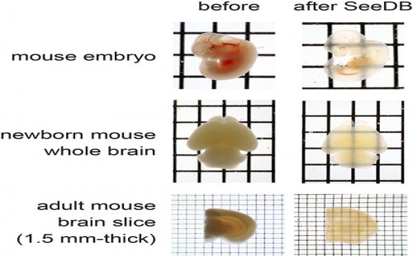 Científicos del centro de investigación RIKEN de Japón han desarrollado una nueva solución acuosa que convierte los tejidos en transparentes en sólo tres días, sin modificar la forma y la naturaleza química de cada muestra. Combinando esta solución con microscopía de fluorescencia los científicos han consesguido obtener imágenes detalladas del cerebro de un ratón.