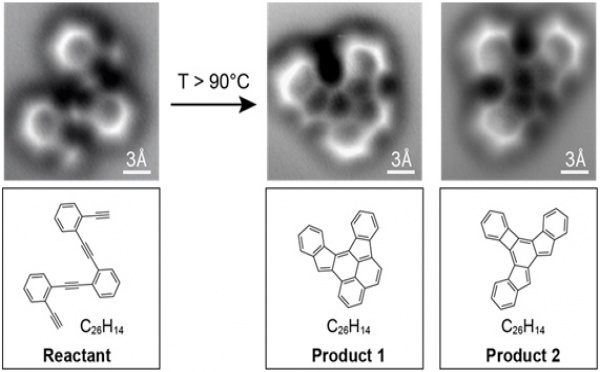 Un grupo de científicos de la Universidad de Berkeley y de la Universidad del País Vasco han conseguido imágenes de gran precisión de una molécula antes y justo después de una reacción orgánica compleja. En ellas se puede apreciar cómo se rompen y se crean los enlaces entre los átomos que forman la molécula. El artículo aparecerá próximamente publicado en Science.