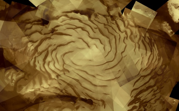 Marte está coronado por un montículo de hielo surcado por oscuras fosas espirales, ha mostrado un nuevo mosaico de imágenes obtenidas por la misión Mars Express de la Agencia Espacial Europea (ESA), que lleva ya 10 años en el espacio. El casquete de hielo tiene unos 1.000 kilómetros de diámetro y sus capas de agua congelada se extienden hasta una profundidad de unos dos kilómetros. Además, han sido moldeadas por los fuertes vientos que predominan en la región.