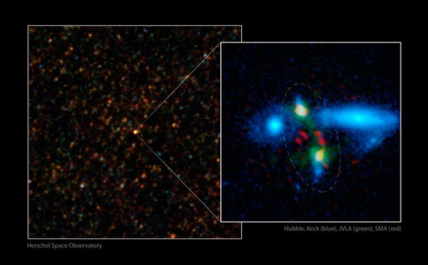 El observatorio espacial Herschel de la ESA ha observado un inusual encuentro entre dos galaxias ricas en gas que presenta la solución a un antiguo problema: cómo se formaron las grandes galaxias pasivas en el Universo primigenio.