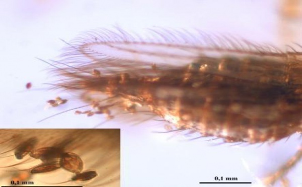 Hace 110 millones de años, en plena era de dinosaurios, un grupo de insectos que transportaba polen quedó atrapado en gotas de resina. Eran cuatro hembras de tisanópteros —o trips—, con el cuerpo recubierto de granos de polen, que se han conservado hasta ahora en una pieza de ámbar de Álava. Se trata de la evidencia de polinización más antigua conocida hasta hoy, y la única del Mesozoico (hace entre 250 y 65 millones de años).