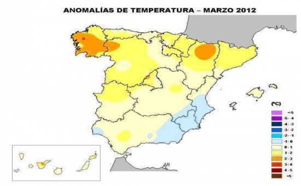 Marzo ha sido un mes más cálido de lo normal, con una temperatura media de 11,6 ºC, que supera en 1ºC a la temperatura media corriente de este mes. En cuanto a precipitaciones, también fue un mes más seco de lo normal, con una media de 24 mm, en torno a la mitad del valor que suele tener.
