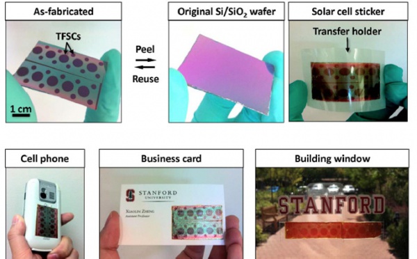 Investigadores de la Universidad de Stanford, en Estados Unidos, han conseguido crear células solares flexibles que se pueden pegar a cualquier tipo de sustrato, como tarjetas de crédito o teléfonos móviles. El avance podría ampliar enormemente las aplicaciones de la tecnología solar, afirman los científicos. Esta misma técnica podría usarse además en electrónica (circuitos impresos, transistores de lámina delgada o pantallas de cristal líquido); así como para desarrollar ropa inteligente.