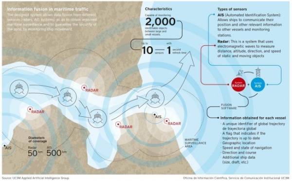 Ingenieros e investigadores de la Universidad Carlos III de Madrid (UC3M) han diseñado un nuevo sistema inteligente de vigilancia marítima que es capaz de integrar y unificar la información de los diferentes tipos de sensores y datos empleados en su contexto real de actuación, a través de metodologías de inteligencia artificial y técnicas de fusión de datos. Esto permite aumentar la eficacia de estos sistemas y su seguridad.