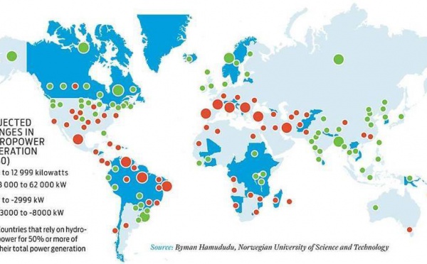 Las zonas de latitudes medias del globo experimentarán reducciones en el caudal de los ríos y, por consiguiente, en la producción de energía hidroeléctrica en el horizonte del año 2050, mientras que otras áreas, como el norte de Europa, África Oriental y el Sudeste Asiático registrarán alzas en los caudales fluviales, según un informe elaborado por IEE Spectrum. Afganistán, Tayikistán, Venezuela y algunos sectores de Brasil aparecen como las áreas con mayores posibilidades de verse afectadas más profundamente por una disminución en la capacidad de producción hidroeléctrica, mientras que en el sur de África períodos extensos de sequía podrían significar una disminución de 70 gigavatios-hora por año en capacidad de generación hidroeléctrica para el año 2050.
