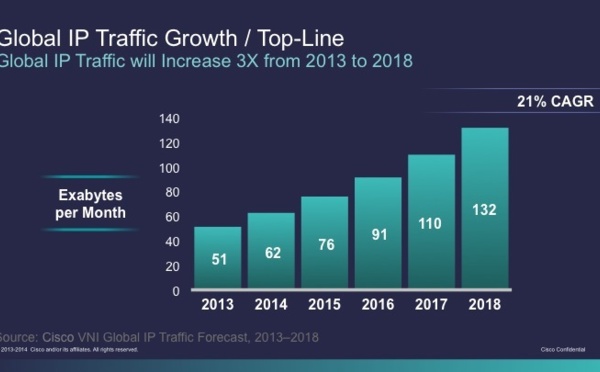 Un informe de la multinacional de equipamiento de redes Cisco prevé que el tráfico total de Internet en 2018 sea casi el triple que actualmente, y que sea mayor que la suma de todo el tráfico de los años anteriores. La adopción de vídeo en ultra-alta definición y las tecnologías máquina-máquina (incluyendo los coches inteligentes) serán algunos de los principales impulsores de crecimiento. En España, el tráfico IP se multiplicará por dos entre 2013 y 2018, y habrá 245,2 millones de dispositivos conectados.