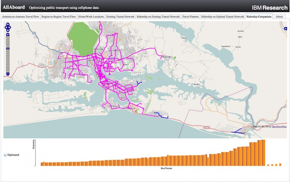 Un trabajo realizado por IBM Research, a partir de datos de interacciones por telefonía móvil facilitados por el operador, muestra que la red de transportes de una ciudad, en este caso Abidjan (Costa de Marfil), puede ganar un 10% de eficiencia ajustando la oferta a la demanda que se deduce de dichos datos. El trabajo ha ganado uno de los cuatro premios otorgados por Orange, a diversas iniciativas científicas con objetivos sociales y que se basan, en todos los casos, en los datos facilitados por la compañía. Por Carlos Gómez Abajo.