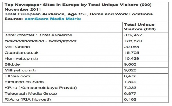 Un reciente estudio realizado por la consultora comScore, líder en medición del mundo digital, ha revelado algunas cifras sobre el uso de Internet en Europa. Los datos obtenidos muestran que 379,4 millones de europeos se conectaron a Internet en noviembre de 2011, con un promedio de 27,8 horas de uso por persona. El estudio señala asimismo que el 47,8% de los europeos visitan webs de periódicos.