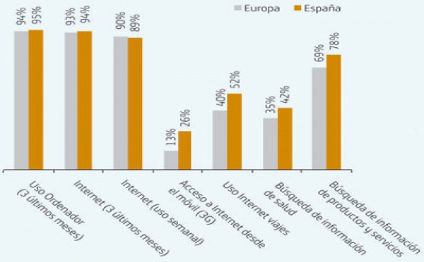 Un reciente informe presentado por Telefónica destaca cómo el año 2011 ha supuesto un fuerte impulso para la Sociedad de la Información en España, principalmente gracias al avance de la digitalización de contenidos y de las actividades más allá del ocio, que crecieron un 34%. El informe pone de relieve asimismo la penetración de Internet móvil en nuestro país, que se sitúa entorno al 20%, mientras que la media de la Unión Europea es del 11%.