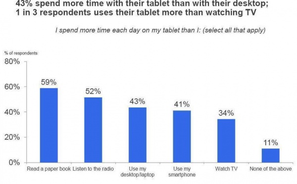 Según una encuesta realizada por Google, el 43% de los usuarios pasa más tiempo utilizando su iPad que su ordenador. En cuanto al uso que se le da a esta nueva herramienta, el ocio gana por una aplastante mayoría. El 84% de los individuos que tienen un iPad lo usa para jugar. El éxito de las tabletas está siendo arrollador.