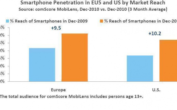 Los europeos se han subido al carro de las nuevas tecnologías y, según un estudio de ComScore, Europa es el segundo productor en el mercado digital. Asimismo, la penetración de los smartphone en el Reino Unido, Francia, Alemania, España e Italia creció en 2010, hasta alcanzar a un 31,1 por ciento de los usuarios de teléfonos móviles. Esta tendencia fue impulsada por las altas tasas de adopción de los sistemas operativos de Google y Apple. En el caso de Google Android, con un aumento del 951 por ciento y en el de Apple, del 115 por ciento.
