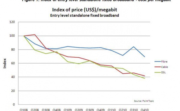 Los consumidores pagan hoy hasta un 50 por ciento menos que en 2008 por el servicio de banda ancha, según un estudio elaborado por Point Topic. Este hecho se debe a la competencia existente, pues los operadores están tratando de introducirse en nuevos mercados para DSL y fibra. A pesar de esto, países emergentes como Malasia, Rusia y Arabia Saudita, pagan tres veces más por la banda ancha que los que pertenecen a mercados más maduros.