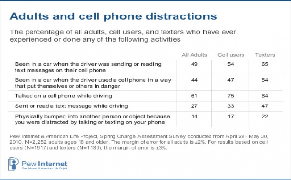 Según un estudio elaborado por investigadores de Pew Research Center, el 47 por ciento de los adultos que mandan mensajes de textos reconocen haberlo hecho mientras conducían. Se trata de un dato muy parecido al obtenido en otras encuestas sobre el uso de la telefonía móvil entre los adolescentes. Esta tendencia se debe a la expansión de este tipo de telefonía