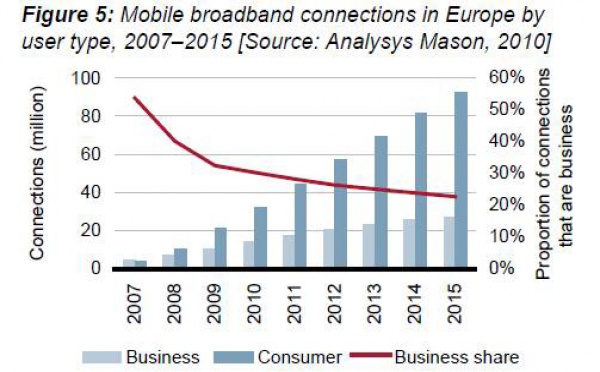 Según un estudio llevado a cabo por la consultora Analysys Manson la banda ancha móvil en Europa alcanzará los casi 120 millones de conexiones en 2015. Tanto es así que, según la Unión Internacional de Telecomunicaciones (UIT), a lo largo del presente año habrá más de 1.000 millones de abonados a esta tecnología en todo el mundo, y sólo en 2009 se llegó a los casi 600 millones de abonados. La evolución de banda estrecha a banda ancha se está convirtiendo en el cambio más radical al que se enfrenta la industria móvil en los próximos diez años.