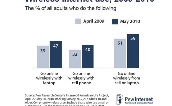 Según un estudio presentado por Pew Internet, el 59 por ciento de la población adulta accede a Internet mediante conexión inalámbrica Wifi o a través del móvil. Las tendencias en lo que a usos del teléfono móvil se refiere están cambiando y cada vez más, los usuarios utilizan este dispositivo para escribir mensajes, hacer fotografías o bajarse vídeos de Internet. Esta tendencia es aún mayor entre la población de entre 18 y 29 años. De hecho, 9 de cada 10 jóvenes tienen ya teléfono móvil y casi todos lo utilizan para enviar mensajes y hacer fotografías.