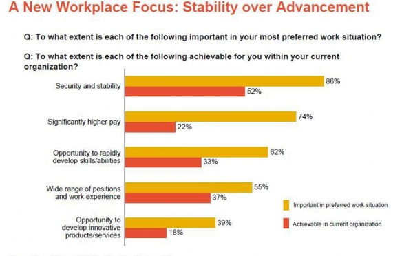 El mundo del trabajo está sufriendo una gran transformación que se vio acelerada por la recesión económica. Un nuevo estudio sobre la fuerza de trabajo global reveló que la seguridad, por encima incluso del crecimiento profesional, es el aspecto más importante para los empleados actualmente, ya que éstos piensan permanecer en sus puestos actuales durante muchos años o, inclusive, durante toda su vida. Si hasta hace poco se hablaba más de una guerra de talentos en la que los trabajadores estarían en constante movimiento, esta investigación recomienda a las compañías prepararse para todo lo contrario.