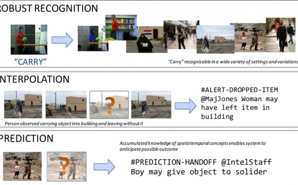 Investigadores de la Universidad Carnegie Mellon participan en el programa Mind’s Eye, patrocinado por el Departamento de Defensa de Estados Unidos, en cuyo marco han desarrollado un software de inteligencia visual capaz de reconocer actividades humanas en un video, y predecir lo que podría suceder a continuación. El objetivo es realizar el seguimiento completo de acciones que pueden quedar ocultas o se producen fuera de cámara.