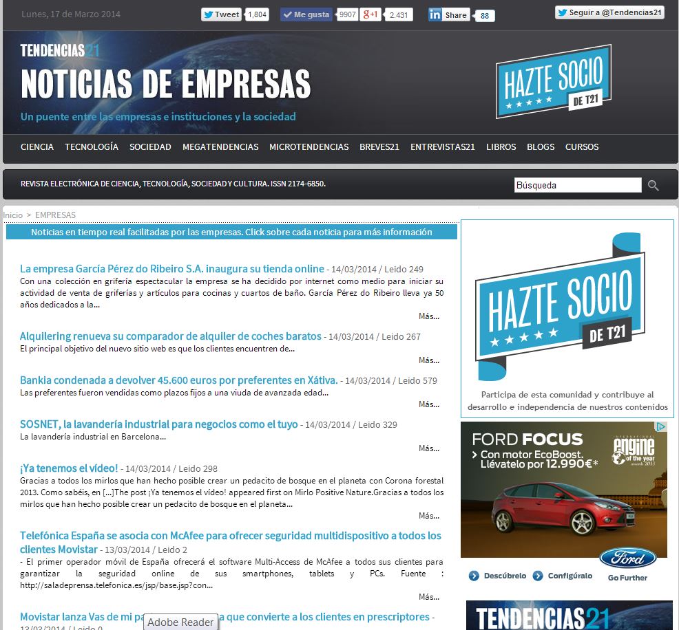 De esta forma, hemos creado un espacio, TENDENCIAS DE LAS EMPRESAS, que se ha convertido rápidamente en un lugar de encuentro de las empresas e instituciones con sus destinatarios. La sección se actualiza automáticamente y reproduce titulares y entradillas de las notas de prensa, permitiendo a los usuarios visitar la web de origen para leer en su integridad el mensaje.