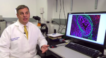Michael Helmrath muestra el tejido intestinal desarrollado en laboratorio. Fuente: Centro Médico del Hospital Infantil de Cincinnati.