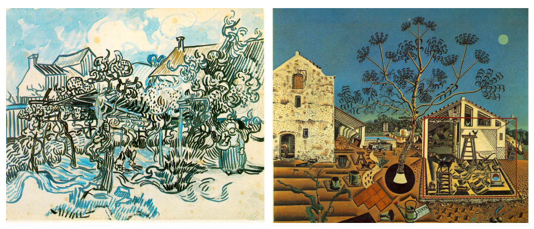 El software vinculó 'Viejo viñedo con mujer campesina' de Van Gogh con 'La Masía' de Miró que, aunque de estilo muy diferente, comparten paisajes y simbolismo. Fuente: Rutgers