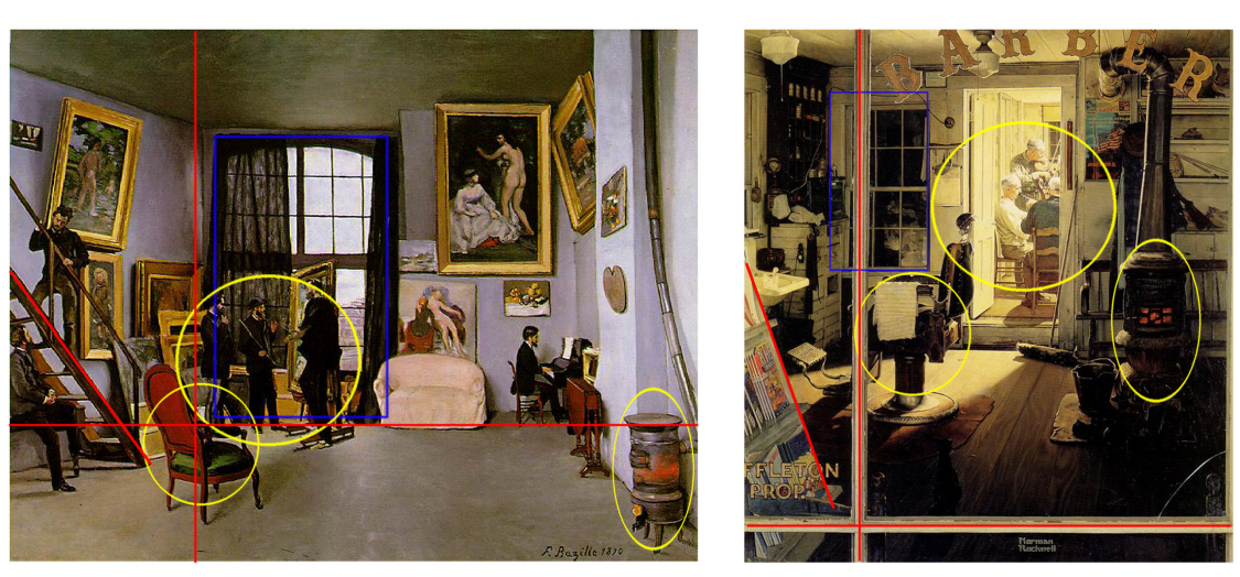 Y es que tanto la pintura de Rockwell de una barbería vista a través de una ventana, como la de Bazille de su estudio tienen estufas de calefacción en el lado derecho; más o menos donde Bazille tiene una ventana, Rockwell colocó una puerta; y la composición de los objetos en ambas obras crea un espacio triangular en la esquina inferior izquierda.
