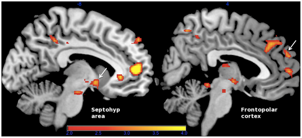 Comparación de la actividad cerebral producida durante los sentimientos de ternura y afecto, frente a la producida al sentir orgullo. Fuente: Plos One.