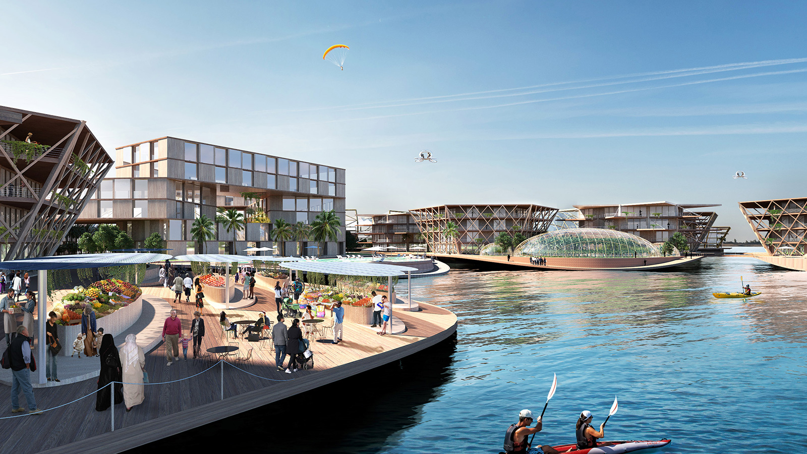 Las representaciones muestran una serie de islas pobladas por estructuras de mediana altura construidas con materiales sostenibles. BIG conceptualizó la arquitectura para que las futuras generaciones de arquitectos pudieran desmontarla y reconfigurarla fácilmente.