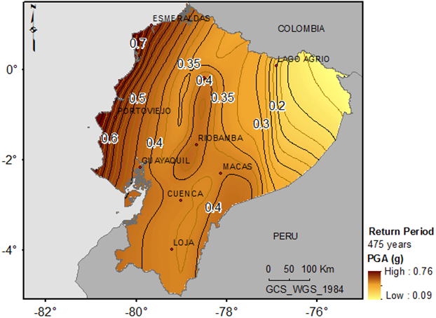 Mapa de peligrosidad sísmica del Ecuador en términos de PGA obtenidos en la tesis doctoral  referenciada para períodos de retorno de 475 años, equivalente al movimiento esperado con 10 % de probabilidad de excedencia en 50 años.