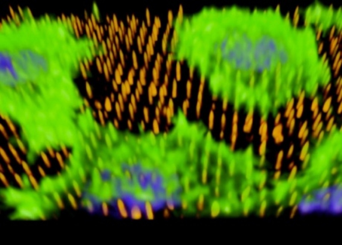 La imagen muestra células humanas (en verde) en nanoagujas (naranja). Los nanoagujas han inyectado ADN en los núcleos de las células (en azul). La imagen fue tomada por los investigadores con microscopía óptica. Fuente: Imperial College London.
