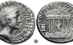 Moneda acuñada por Augusto que muestra el templo que se dedicó a César (su padre adoptivo) como divino tras su muerte (