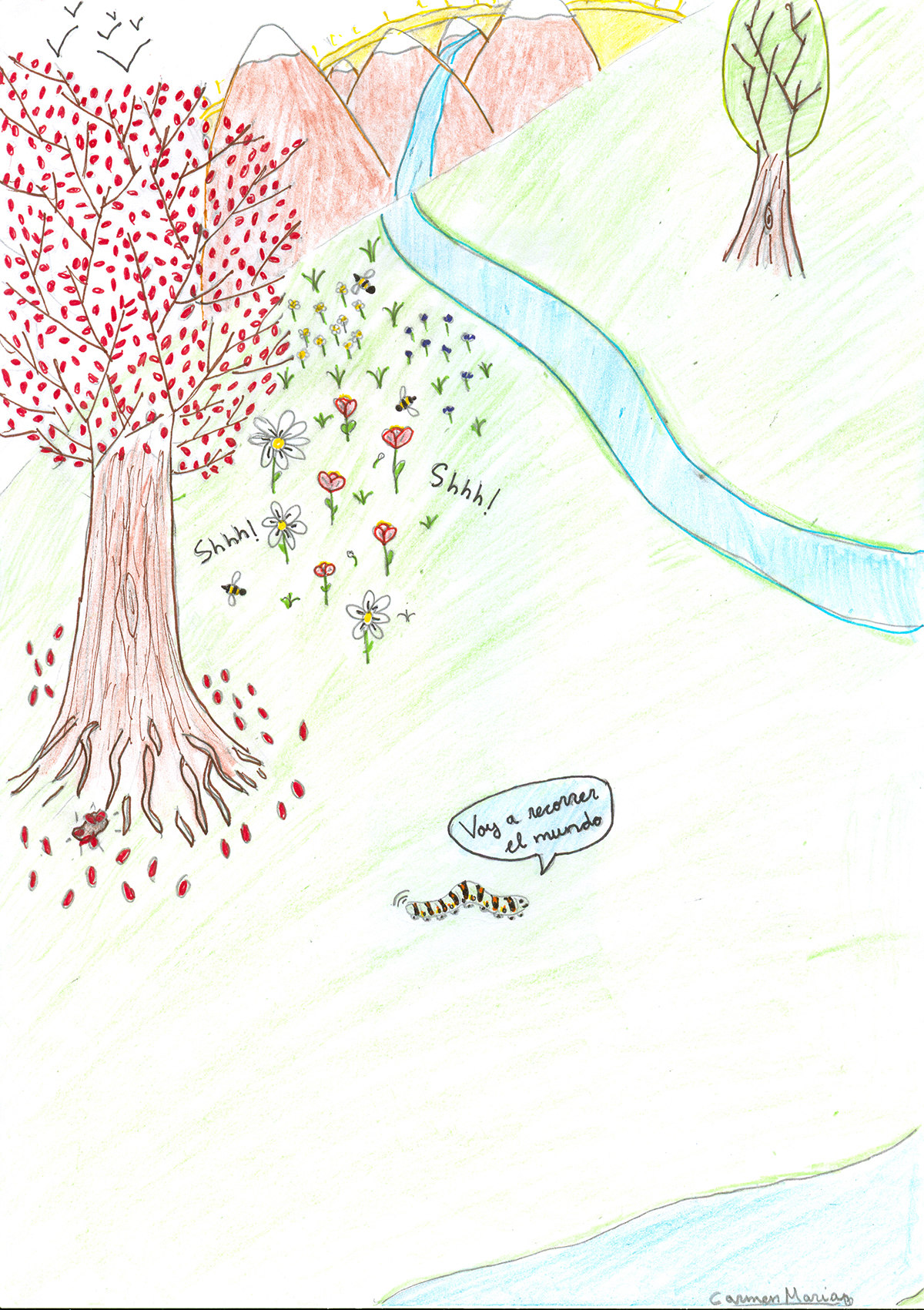 Debajo del pruno, que estaba en el jardín, tenía su casita, escondida en medio de las raíces, una pequeña y tímida oruga. Cada día, cuando salía el sol, y cuando todos los que vivían alrededor de aquel lugar se despertaban, con los trinos de los madrugadores pájaros, nuestra amiga asomaba su cabecita por un pequeño orificio hecho en la tierra y tapado con las hojas que del árbol se iban cayendo, unas hojas que alfombraban de rojo el suelo.