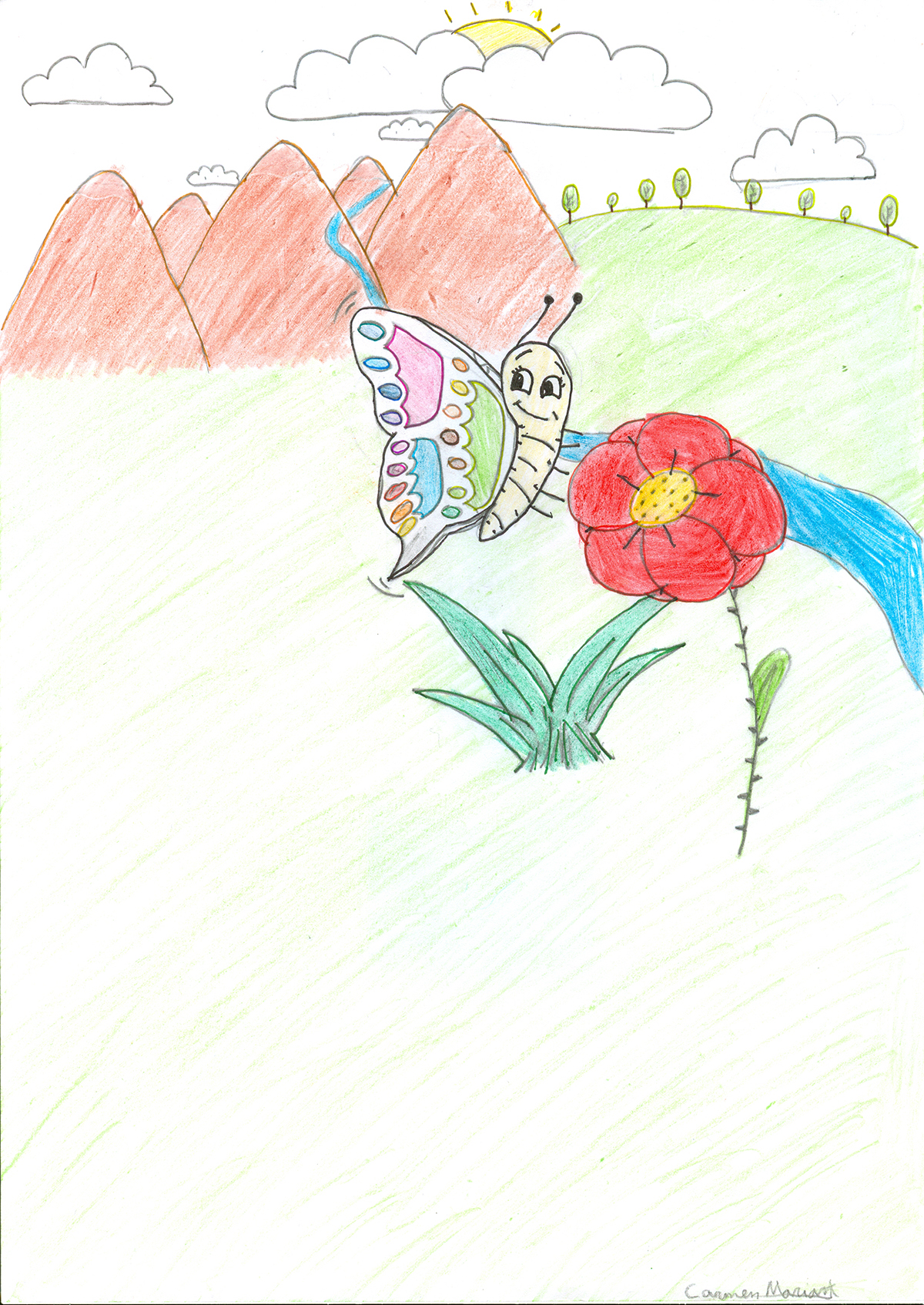 Nuestra amiga oruga, cada vez que se asomaba a la puertita de su casa descubría asombrada alguna cosa nueva que le hacía pensar que el mundo exterior era inmenso, y que estaba lleno de maravillas: le sorprendía los colores de las flores, las gotas de rocío que se acumulaban en las superficies de las hojas, los diferentes trinos de los pájaros, la laboriosidad de las hormigas.