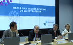 Acto seguido, tomaron la palabra los autores del libro “Hacia una teoría general de la estrategia”. Sandra Massoni lo presentó como un “eclipse” que debería dar lugar a nuevas visiones y procesos profesionales. Mientras Rafael Alberto Pérez lo presentó como una “polifonía”, subrayando que la nueva teoría estratégica que presenta este libro es fruto de los debates de FISEC (Foro Iberoamericano sobre Estrategias de Comunicación) y de las aportaciones de los11 expertos de 6 países iberoamericanos- algunos de ellos presentes en el acto - que han enriquecido con sus métodos y modelos de acción la III Parte de la obra. Finalmente destacó la valentía y el coraje de Enrique V. Iglesias por introducir una obra tan rompedora como esta. Las cuestiones que los autores platearon acerca de su teoría despertaron el interés de los asistentes al acto, dando lugar a un coloquio que hubo que interrumpir por razones de la hora, tras más de 80 minutos de rico diálogo.