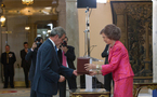 Su Majestad la Reina Doña Sofía hizo entrega de la Medalla de Honor de la Escuela que lleva su nombre a César Alierta, presidente de Telefónica y mecenas de la Cátedra de Violín, en la ceremonia de clausura del curso académico 2010-2011 en el Palacio del Pardo.
