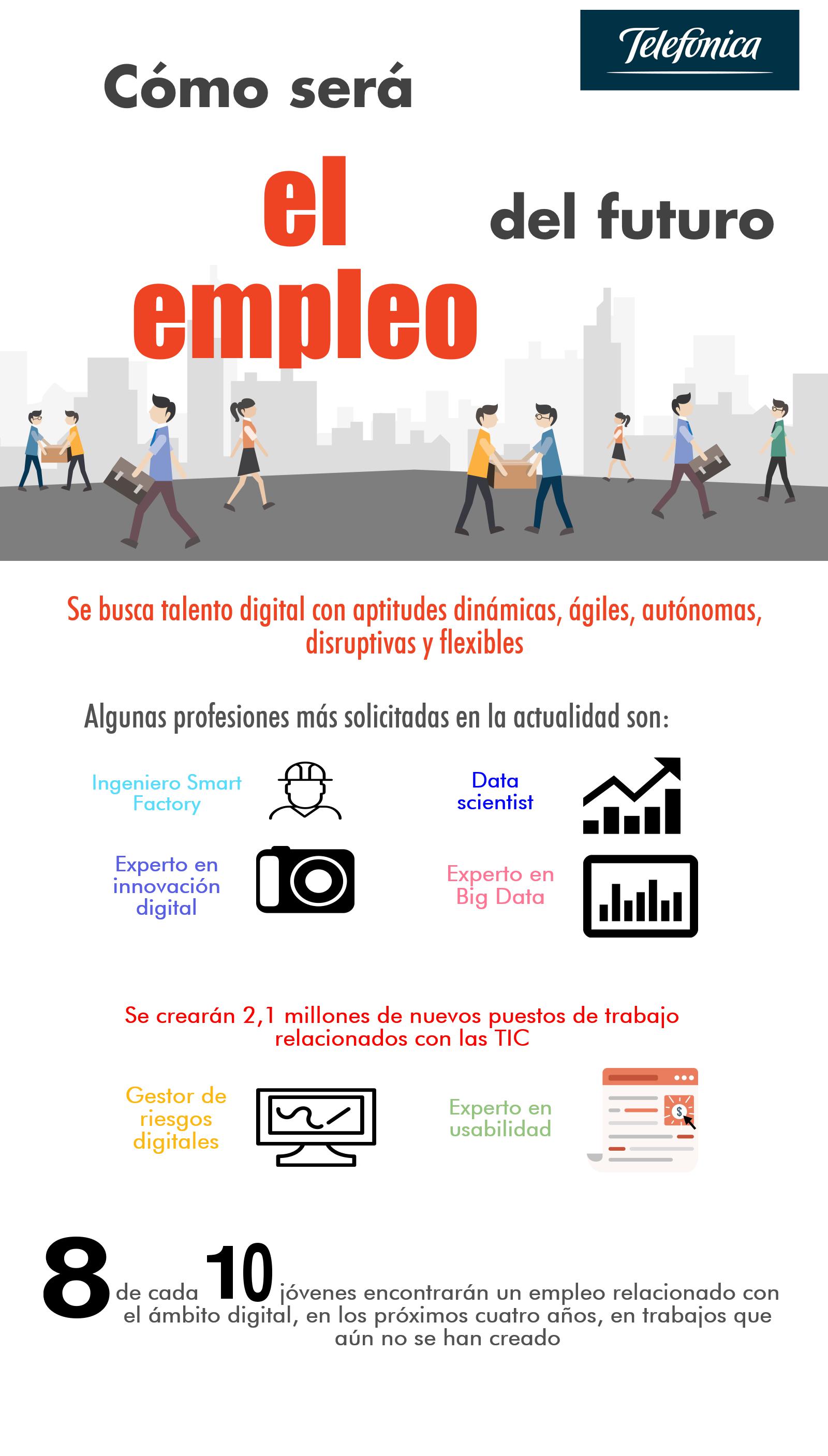El empleo está cambiando, y cada vez más se están creando nuevas profesiones que antes no existían y que tienen que ver con las TIC. Según el Observatorio para el Empleo en la Era Digital, ocho de cada diez jóvenes encontrarán un empleo relacionado con el ámbito digital, en los próximos 4 años, en trabajos que aún no se han creado. Algunas de las diez profesiones más solicitadas en la actualidad, todas ellas relacionadas con las TIC, son ingeniero Smart Factory, experto en innovación digital, data scientist, experto en Big Data o en usabilidad así como gestor de riesgos digitales.