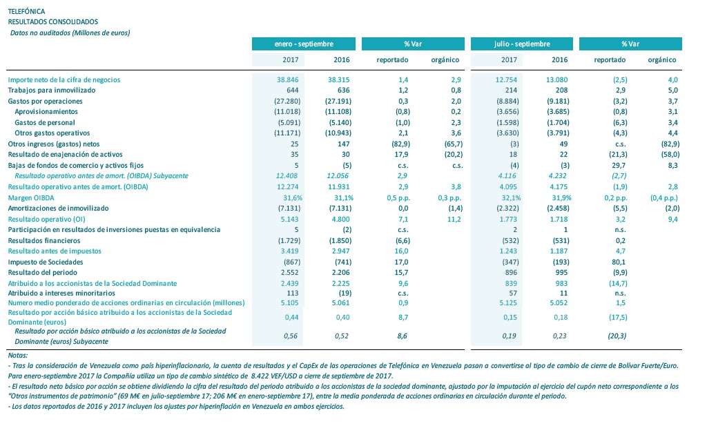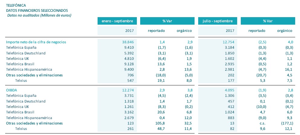 El OIBDA asciende a 4.095M€ en el periodo julio-septiembre (+2,8% orgánico vs 3T16; -1,9% reportado). Excluyendo el impacto de la regulación, habría aumentado el 5,2% orgánico interanual.
