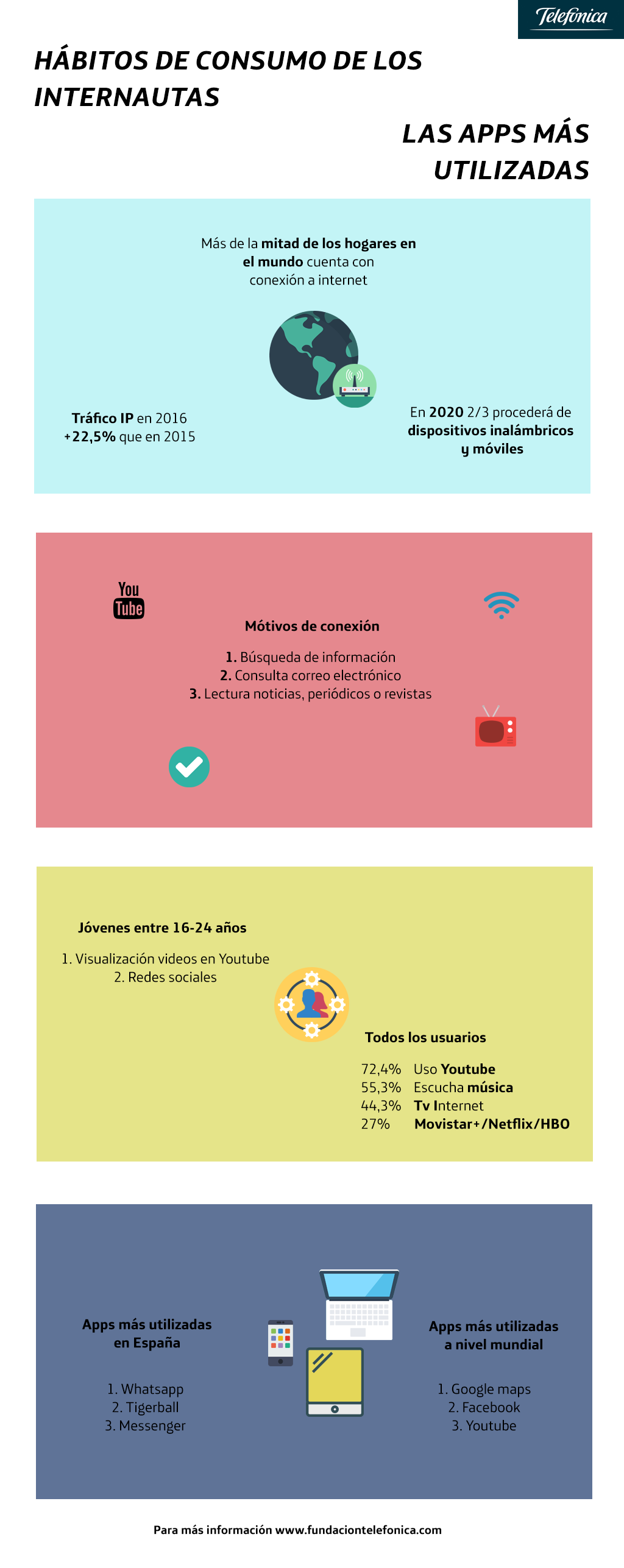 Más de la mitad de los hogares en el mundo cuenta con conexión a Internet. Ésta es una de las afirmaciones publicadas en el Informe de la Sociedad de la información 2016 de Fundación Telefónica que pone de manifiesto la importancia y la creciente demanda de conectividad a nivel universal. El informe añade, además, que la banda ancha móvil es la que muestra un crecimiento cada vez más acentuado. Este hecho revela la importancia que tiene para los usuarios la movilidad y la ubicuidad. Esta conectividad móvil se transforma en una seña de identidad de los usuarios según sus hábitos de consumo.