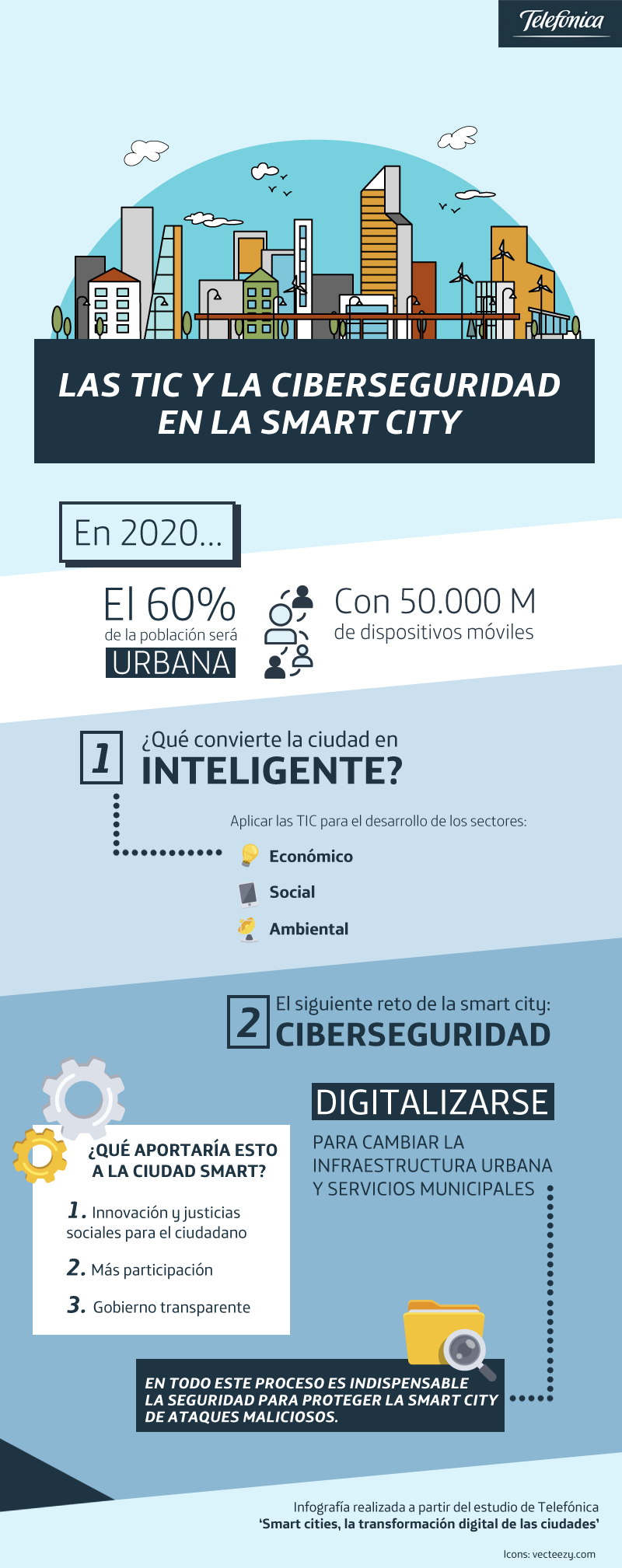 Las ciudades han ido incorporando las nuevas tecnologías a su gestión, haciéndose “más inteligentes”, lo que permite optimizan recursos, ahorrar dinero y proporcionar mejores servicios a los ciudadanos. Según los resultados del Estudio ‘Smart Cities, la transformación digital de las ciudades ’ de Telefónica, en el año 2020, el 60% de la población será urbana y habrá 50.000 millones de dispositivos conectados.