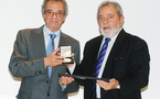 El ex Presidente de Brasil, Luiz Inázio Lula da Silva ha visitado este viernes la sede de Telefónica en Madrid, Distrito C. Lula ha recorrido las instalaciones más representativas del campus de Telefónica acompañado del Presidente de la compañía, César Alierta, el consejero delegado, Julio Linares, y el presidente de Telefónica Latinoamérica, José María Álvarez-Pallete, y ha podido saludar a un grupo de profesionales brasileños destacados en España. El ex presidente de Brasil se interesó por algunos de los proyectos más innovadores que está desarrollando Telefónica en el ámbito de e-Health o el uso de la tecnología NFC en este campus empresarial. En su visita a Distrito C, Lula recibió de manos de César Alierta la Medalla de Oro TISA en reconocimiento a su impulso al desarrollo de las nuevas tecnologías de la comunicación en Brasil.