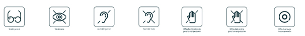 Los dispositivos irán etiquetados con iconos, en función de su idoneidad ante visión baja o nula, audición baja o nula, dificultad moderada o severa para la manipulación y dificultad para la comprensión.