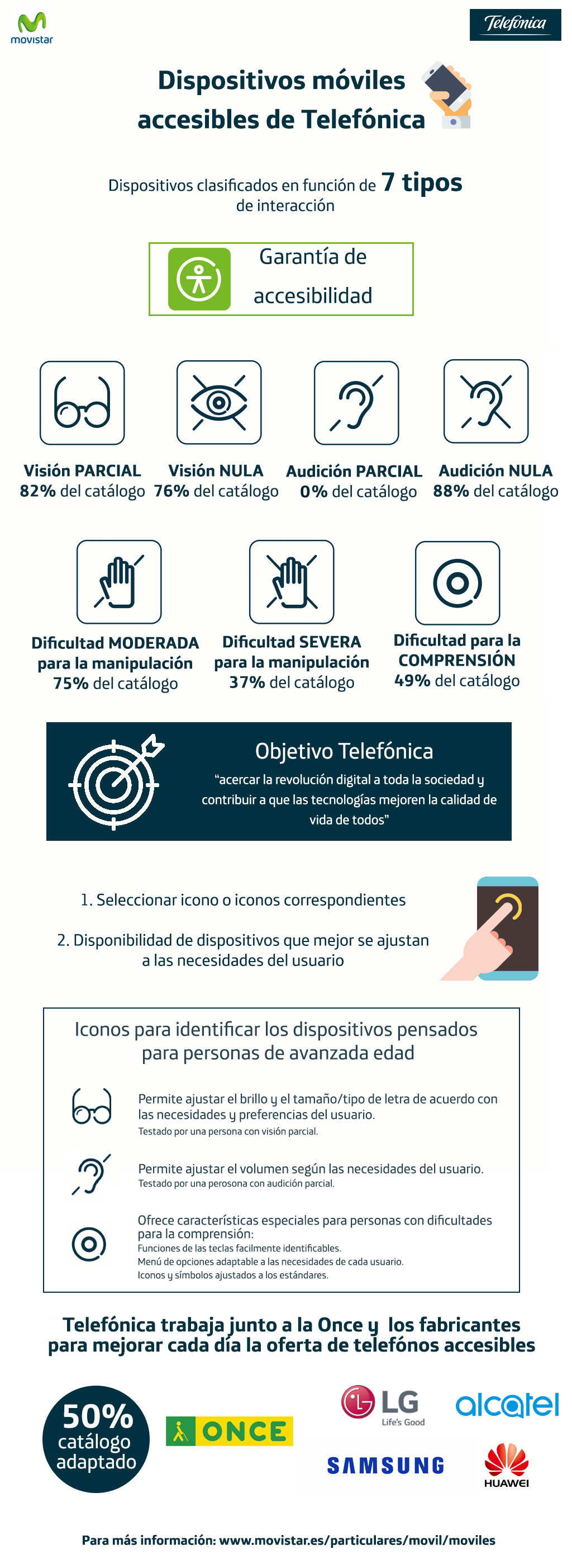 Movistar, que anuncia esta iniciativa en vísperas del Día Internacional de las Personas con Discapacidad, que se celebra el 3 de diciembre, ya ha incluido esta información en el 50% de su catálogo y para ello ha contado con la ayuda de Fundación ONCE, socio de referencia de Telefónica para el mercado de habla hispana, que ha realizado la labor de asesoramiento en la experiencia de uso de cada dispositivo, así como con la colaboración de los fabricantes –Huawei, LG, Samsung y TCL Communication -, que han cedido sus terminales para que la ONCE hiciera su trabajo. Además, Telefónica seguirá trabajando con los fabricantes y proveedores de sistemas operativos para mejorar la accesibilidad de sus terminales.