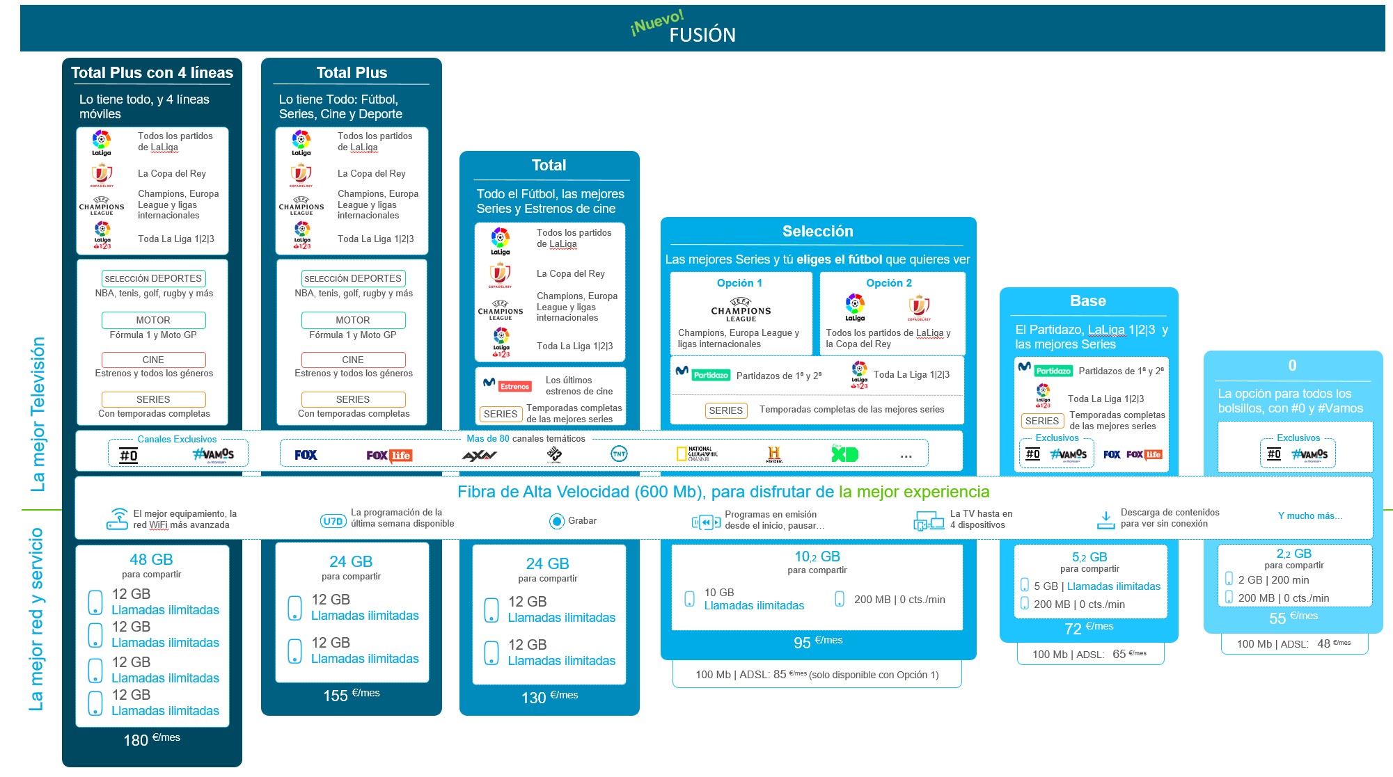 Telefónica lanzará a finales del mes de octubre un nuevo portfolio de Movistar Fusión que persigue, por un lado, simplificar la oferta disponible para los clientes, al pasarse de diez a seis productos, y, por otro, facilitar el acceso a uno de los contenidos más demandados por los clientes, el fútbol.