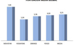 Respecto a la valoración global, Movistar ocupa la primera posición con una nota de 8,10 puntos, dos por encima de Vodafone y Yoigo y a más de 2,7 de Orange. Esta diferencia tiene sus causas en el caudal de descarga en relación con la velocidad ofertada, en el servicio de atención al cliente y los precios y prestaciones de las ofertas clásicas más que en las diferencias que de estos elementos se aprecian en los productos combinados de telefonía fija y móvil y banda ancha fija y móvil.