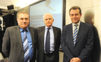 Javier Aguilera, director de Desarrollo de Negocio de Telefónica España, Jaime Gaiteiro, director general Corporativo de RTVE, y Paolo Vasile, consejero delegado de Mediaset España, han presentado hoy en Madrid la apuesta de estas empresas por el desarrollo de la televisión conectada con el estándar Hybrid broadcast broadband TV (HbbTV) definido dentro de la UER (Unión Europea de Radiodifusores) y el comienzo de las pruebas piloto. Este estándar europeo combina los servicios de radiodifusión y banda ancha.