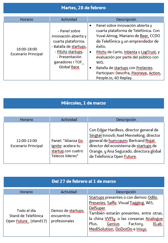 El segundo panel se celebra el miércoles, 1 de marzo, a las 12 horas, bajo el nombre de “Alianza Go Ignite: acelera tu startup con cuatro Telecos líderes”, y recogerá los planteamientos de distintas empresas de telecomunicaciones sobre cómo entienden la innovación abierta y cómo esta está redefiniendo el modelo tradicional de innovación. Intervendrán Edgar Hardless, director general de Singtel Innov8; Axel Menneking, director general de hum:raum; Bertrand Rojat, director del ecosistema de startups de Orange, y Ana Segurado, directora global de Telefonica Open Future. El acto finalizará con el anuncio de una nueva convocatoria internacional para emprendedores y startups.