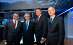 En la imagen, el presidente de Telefónica, César Alierta, junto al CEO de Telefónica Alemania, René Schuster, flanqueados por los señores Francioni (a la izquierda de la imagen) y Gerstenschlaeger (a la derecha), ambos representantes de la bolsa de Frankfurt, en el acto de salida a bolsa de Telefónica Alemania.