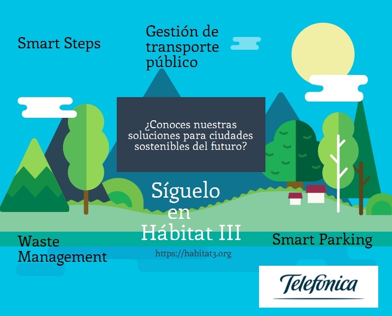 Telefónica, consciente de que en los espacios urbanos del presente y futuro, la colaboración público-privada en el desarrollo e impulso de la tecnología aplicada a los servicios de las ciudades mejoran la eficiencia de la gestión local, participa en el gran evento de Hábitat III, la Conferencia de las Naciones Unidas sobre Vivienda y Desarrollo Urbano Sostenible.