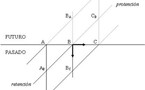 Hay que insistir en que sobre la línea de los ahoras A es anterior a B, pero no es pasado con relación a B, sino que lo que es pasado con relación al ahora B es el esbozo, o retención, AB que se hunde en el semiplano inferior. No cabe, por tanto, establecer entre los puntos que configuran la línea de los ahoras una relación de pasado a futuro, como la que aparece en la representación original errónea ya mencionada, pues estas categorías distensivas resultan sólo aplicables a los contenidos pertenecientes a los dos semiplanos (el inferior y el superior) que representan las vertientes pasado y futuro del campo de presencia. Al margen de las categorías temporales distensivas recién mencionadas, la relación entre los puntos A, B, C, etc., que conforman la línea de los ahoras, será, por lo tanto, una relación de antes a después, basada únicamente en las categorías extensivas del citado campo.