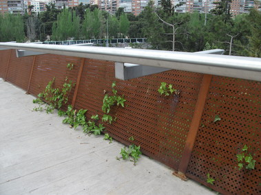 En este detalle se observa como el diseñador-diseñadora (suele ser labor de equipo), ha trascendido hasta el mínimo, hasta la menor escala de lo pequeño. El paramento que forma la barandilla es de "acero corté", un tipo de hierro pre-oxidado que puso de moda el BBV del complejo "Azca" de la Castellana (allá por 1980 -otra vez mi Maestro, Oíza-) y que presenta muy buen comportamiento resistente. La perforación, sutilísima, sin duda se debe a dos factores: